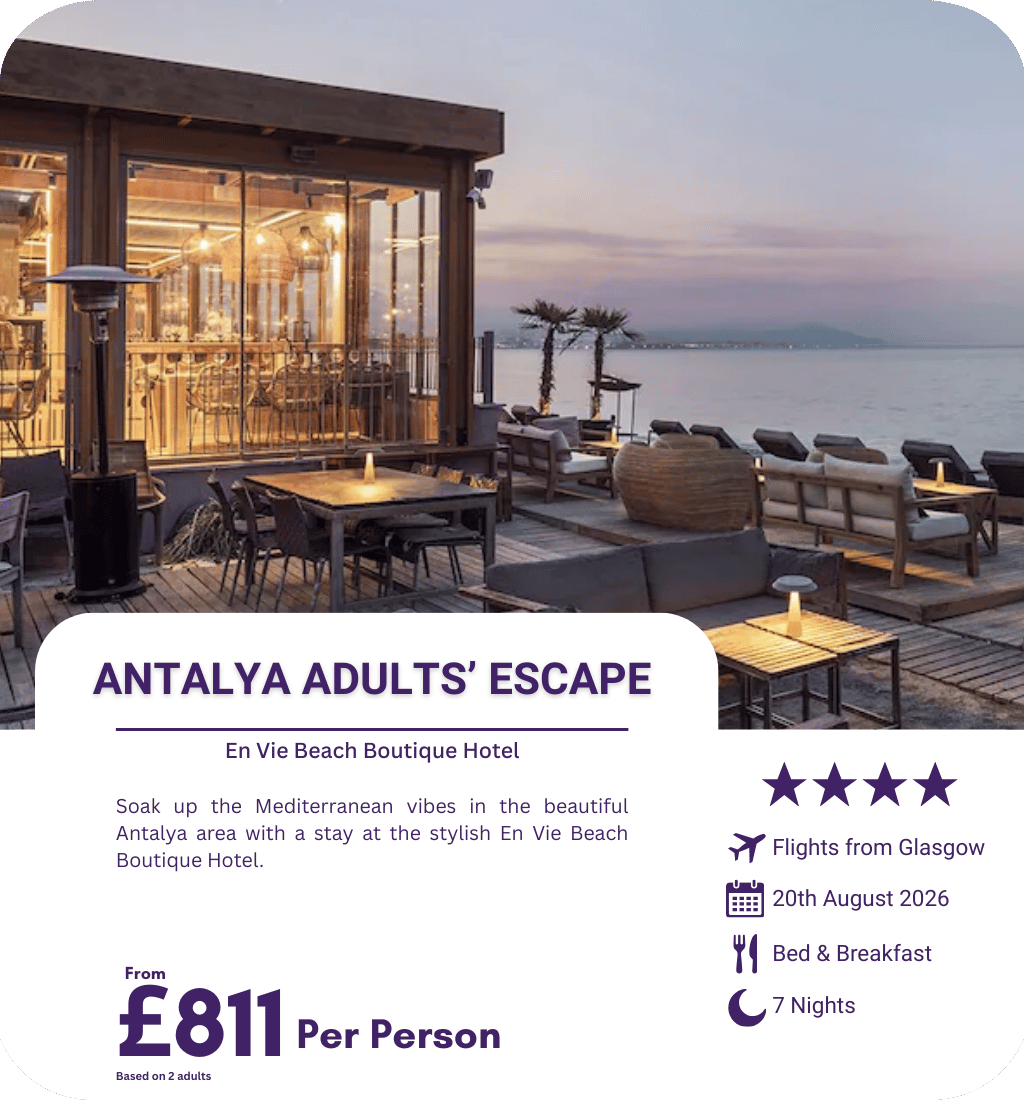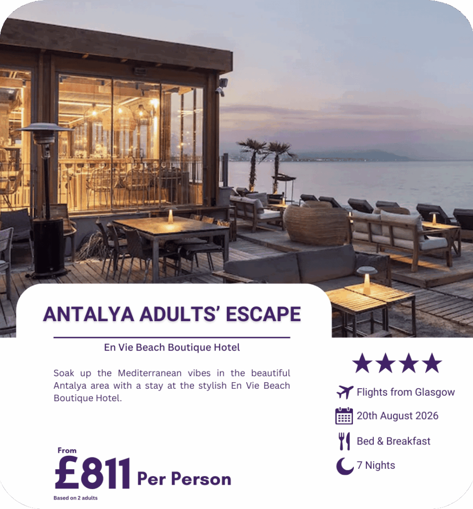 Win with Thorne Travel, Jet2holidays and Now Ayrshire Radio – enjoy a 7-night 5★ Ultra All-Inclusive family holiday to Turkey, flying direct from Glasgow with Jet2holidays.